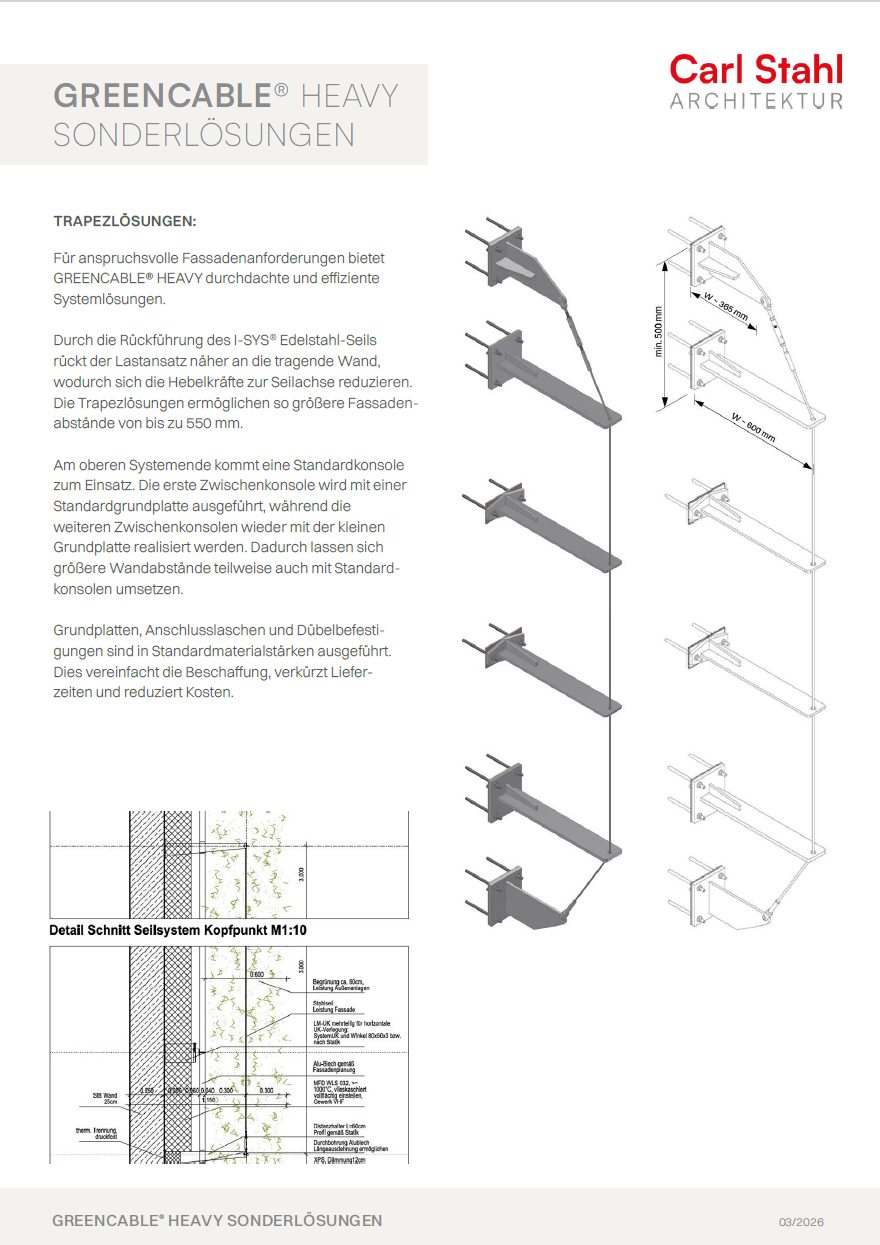Downloads GREENCABLE LIGHT DATENBLATT Download (pdf) CAD DATA Download (dwg) AUSSCHREIBUNGSTEXT Download (pdf) GREENCABLE HEAVY DATENBLATT Download (pdf) CAD Daten Download (dwg) CHECKLISTE Download (pdf) Heavy Sonderlösungen Download (pdf) STÜCKLISTE HEAVY STEEL & CONCRETE Download (pdf) EPD Heavy – W 291 Download (pdf) STÜCKLISTE HEAVY WOOD Download (pdf) EPD Heavy – W 365 Download (pdf) AUSSCHREIBUNGSTEXT Download (pdf) EPD Heavy – W 425 Download (pdf) Wissenswertes FlyerKreative Begrünung Download (pdf) Vorteile und LeitfadenFassadenbegrünung Download (pdf) Windlastzonenin Deutschland Download (pdf) GREENCABLEPflanzenliste Download